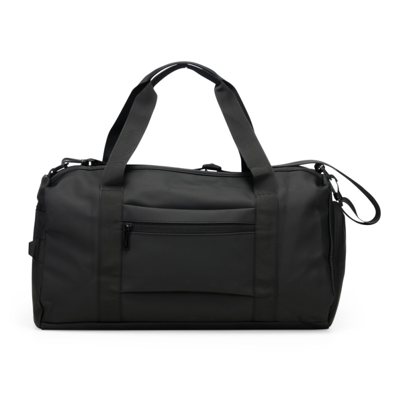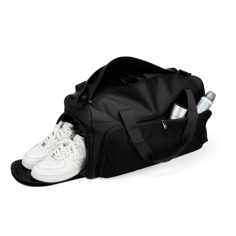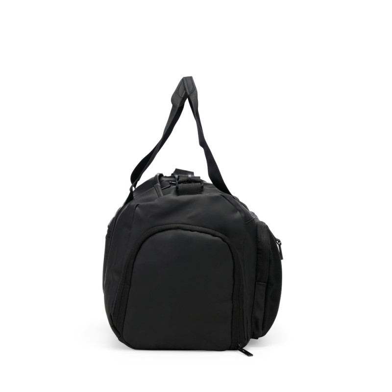 Descrição: Bolsa confeccionada em couro sintético com capacidade de até 32 litros. Apresenta compartimento interno com bolso de zíper e outros dois bolsos abertos. Conta ainda com cinco compartimentos externos em diferentes tamanhos, incluindo um lateral dedicado para tênis, um bolso menor com encaixe para malas e outro para itens molhados. Possui duas alças de mão e alça transversal removível.