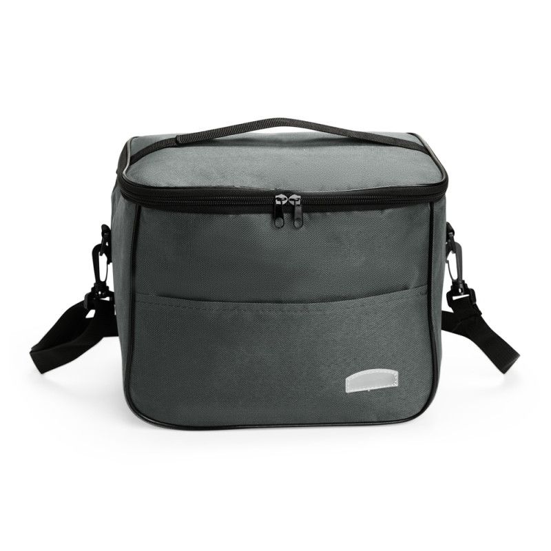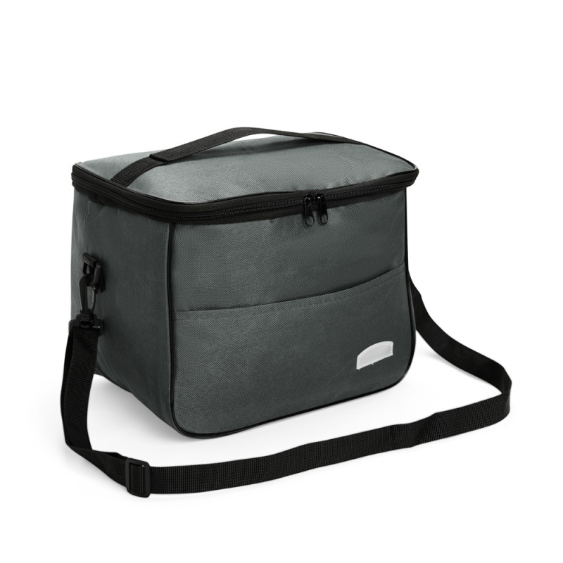 Descrição: Bolsa térmica feita em Oxford resistente à água, com fechamento em zíper e capacidade de até 16 litros. Possui revestimento térmico em folha de alumínio, bolso frontal externo e duas alças: uma fixa localizada na tampa e outra transversal removível.